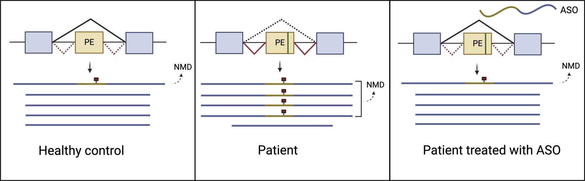 For each patient’s genetic variant, Tang also designed antisense oligonucleotides—short, synthetic DNA strands that bind to and alter RNA or modify protein expression—to target these poison exons and found that they successfully reduced the amount of poison exons in the genetic transcript.